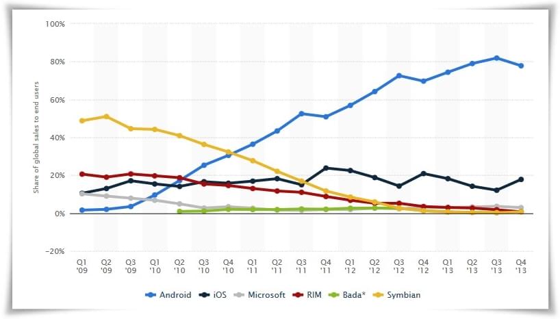 Em 2008 — o primeiro ano oficial do Android — o Symbian estava em mais de 50% dos aparelhos celulares vendidos, enquanto o OS da Google fechou aquele ano sem conseguir conquistar sequer 1% desse mercado.